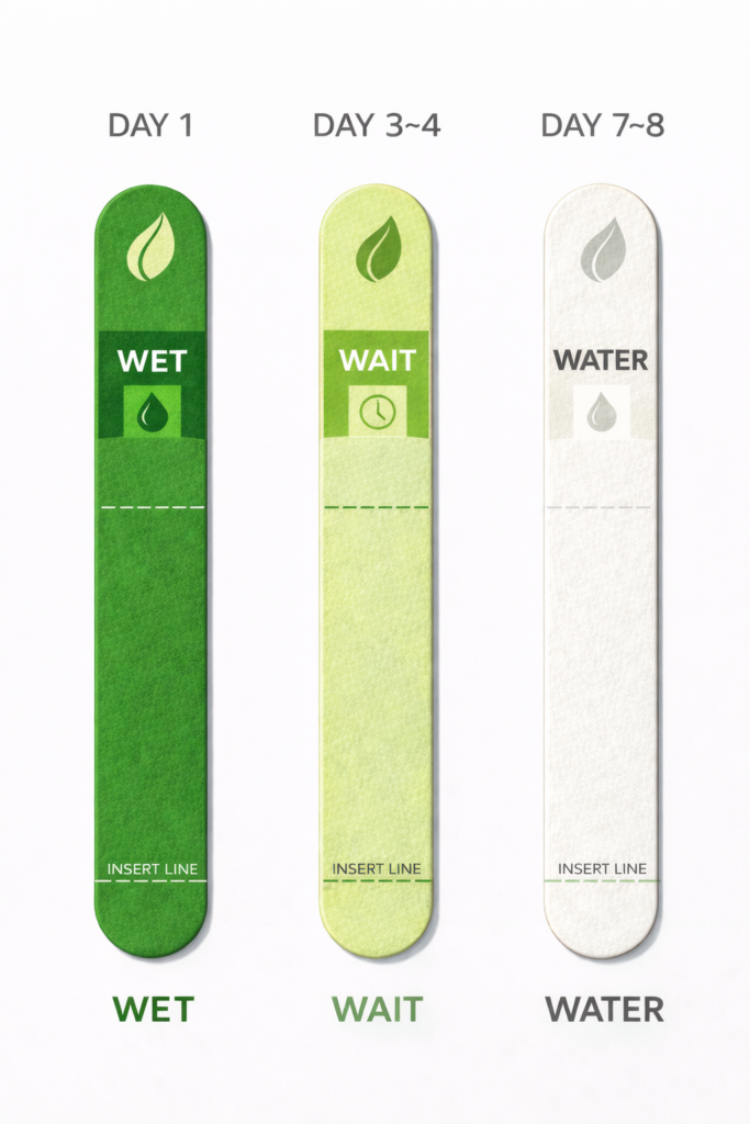 Observera den hydrokromiska färgen som visar WET, WAIT eller WATER för att bedöma växtens behov av vatten.